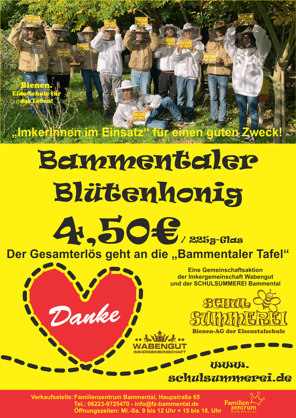 In einer Gemeinschaftsaktion mit der Imkergemeinschaft Wabengut und unserer "SCHULSUMMEREI" beteiligen wir uns an der nächsten Aktion für die "Bammentaler Tafel".  100 Gläser sollen verkauft werden. Der Gesamterlös dieser Aktion geht direkt an die Tafel. Mit den Einnahmen sollen dringend benötigte Lebensmittel für die Tafelkunden gekauft werden. Bei diesem "Einsatz" sind wir gerne mit dabei.